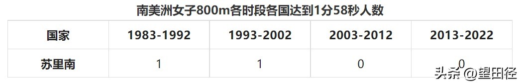 南美洲区女子800米发展水平同样一般,迄今为止只有一个国家有运动员达到1分58秒。