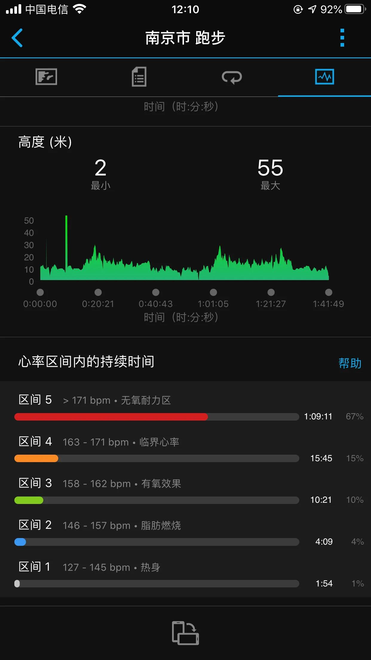不过遇到两个问题:一个是心率今天特别高,平均176,最高196,按我年龄来说,这个心率太高了,67%的时间处于5区,也太不可能了。不知道是佳明的问题,还是我最高心率确实高,看来要找时间测一测最高心率。