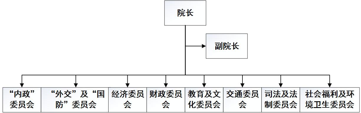 “立法院”内分成8个常设委员会:“内政”委员会、“外交”及“国防”委员会、经济委员会、财政委员会、教育及文化委员会、交通委员会、司法及法制委员会、社会福利及环境卫生委员会。