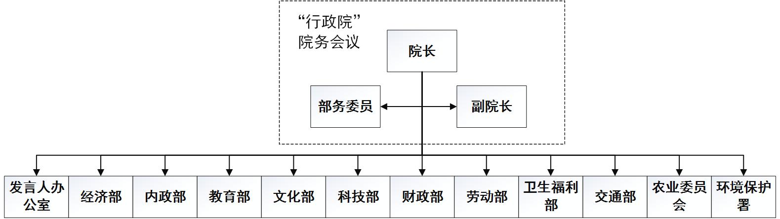 “行政院”组成部门有:行政院发言人办公室、经济部、内政部、教育部、文化部、科技部、财政部、劳动部、卫生福利部、交通部、农业委员会、环境保护署、“国防部”。各部门负责制定政策、规划、监督和执行任务,是行政院的具体实施机构。