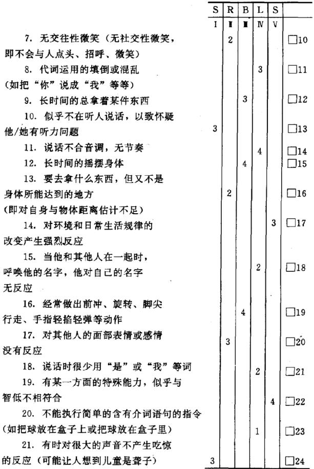 其评分方法是按每项在量表中的负荷大小而分别给评“1”、“2”、“3”、“4”分。如第X项分值是“3”,所以,只要儿童有该项表现,无论症状表现轻重都评“3”分。为方便使用,设计者在每项后标明了应得的分。本量表项目数量适中,评定只需10一15分钟便可完成,对不同年龄、不同性别者使用无差异,其信度、效度均较好。
