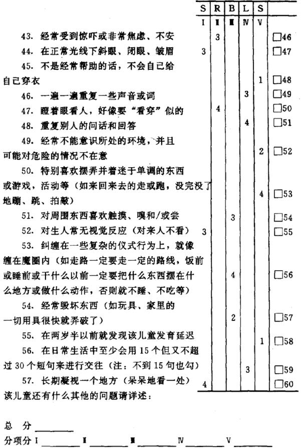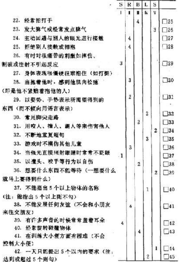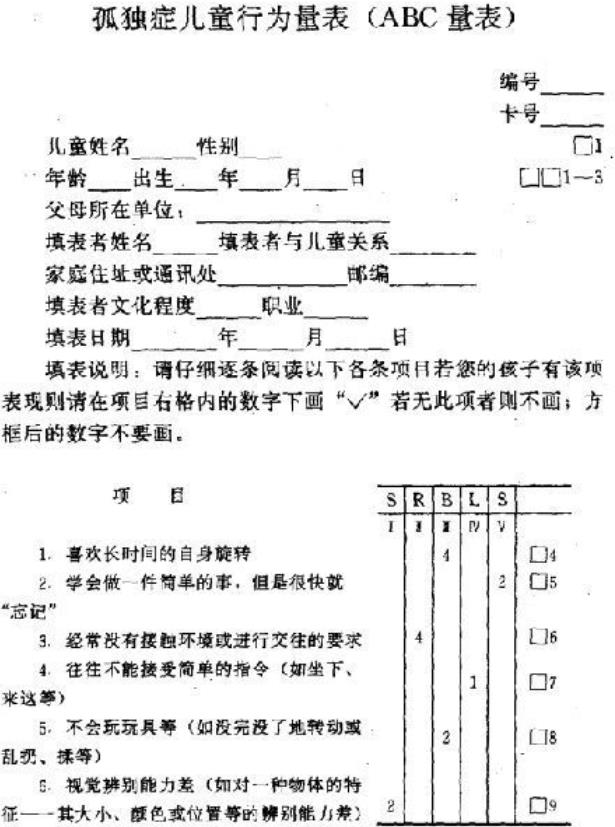 使用时,首先让家长根据孩子近期的表现,在ABC量表上每个项目的相应数字上画“√”,然后计算各分测验的分数和量表总分。如果受测者的量表总分等于或高于31分,可怀疑为患有;如果受测者的量表总分等于或高于62分,可以诊断为患有。