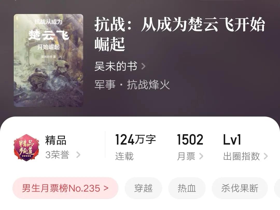 现在这类抗战军事文管的非常严,几乎都以亮剑开头,但大部分写的让人毒发身亡,这本还不错,主角穿越成了楚云飞,一步一步发展壮大,虽然这本书的整体逻辑以及细节方面也就那样,但当成一本爽文看还是可以的。