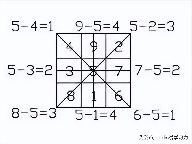 洛书转为九宫格数字如图20,然后每个数字和中间数字5相减(大减小),求得的差如图20。其中,坤~乾的数值为4-3-2-1,表示阴消后的数值(剩下的阴数)。乾~坤的数值为4-3-2-1,表示阳减后的数值(剩下的阳数),画四个间隔相同的同心圆,把数值放上去,连成平滑曲线,生成图21。