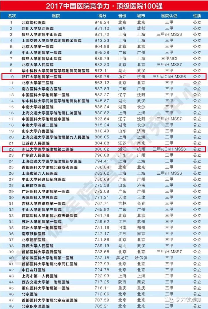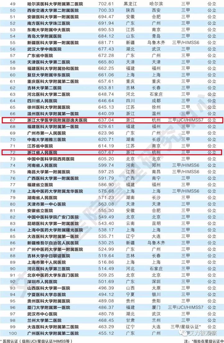 在百强名单中杭州一共有4家医院成功入选,浙江大学医学院附属第一医院更是跻身前十!