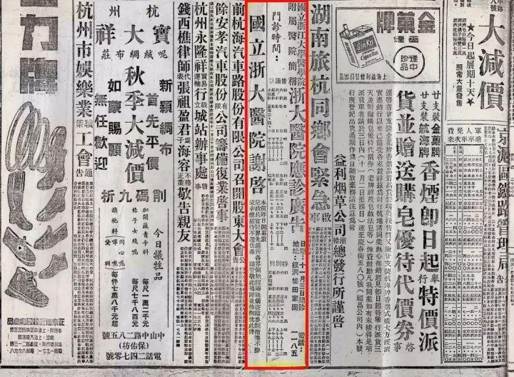 开业翌日,《浙江日报》的前身《东南日报》,在中缝位置刊登浙大医院广告,让这座新生医院第一次展露在公众视野前。