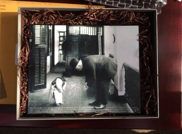 王建安告诉记者,浙医二院送给奥巴马的礼物是一幅版画,上面印着的是浙医二院最经典的老照片——浙二第一任院长梅腾更先生跟一个小患者相互鞠躬的相片。
