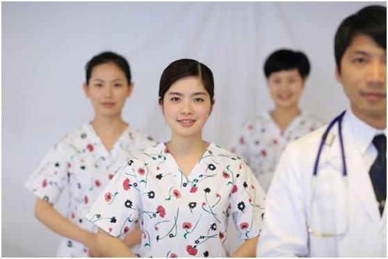 花色的护士服具有西方护理文化的色彩,我们不仅借鉴了西方发达国家医院的先进管理模式和理念,也把他们的人文关怀理念在细节中体现出来。以医院的特殊环境为关注点,把温馨、美观的自然之美融入在服装里,一举一动尽显无限爱心。