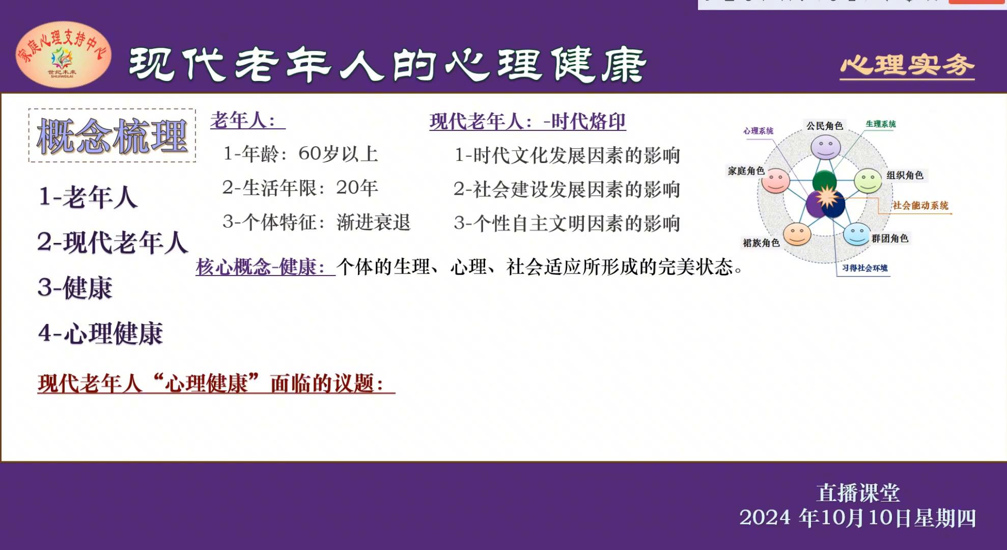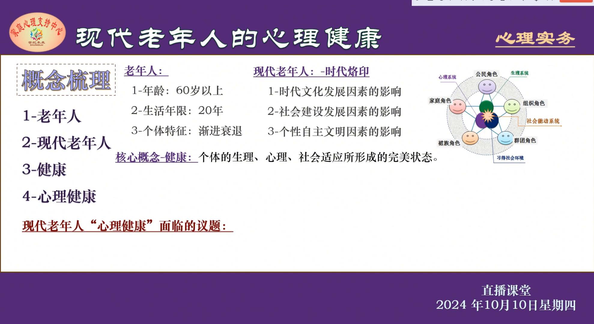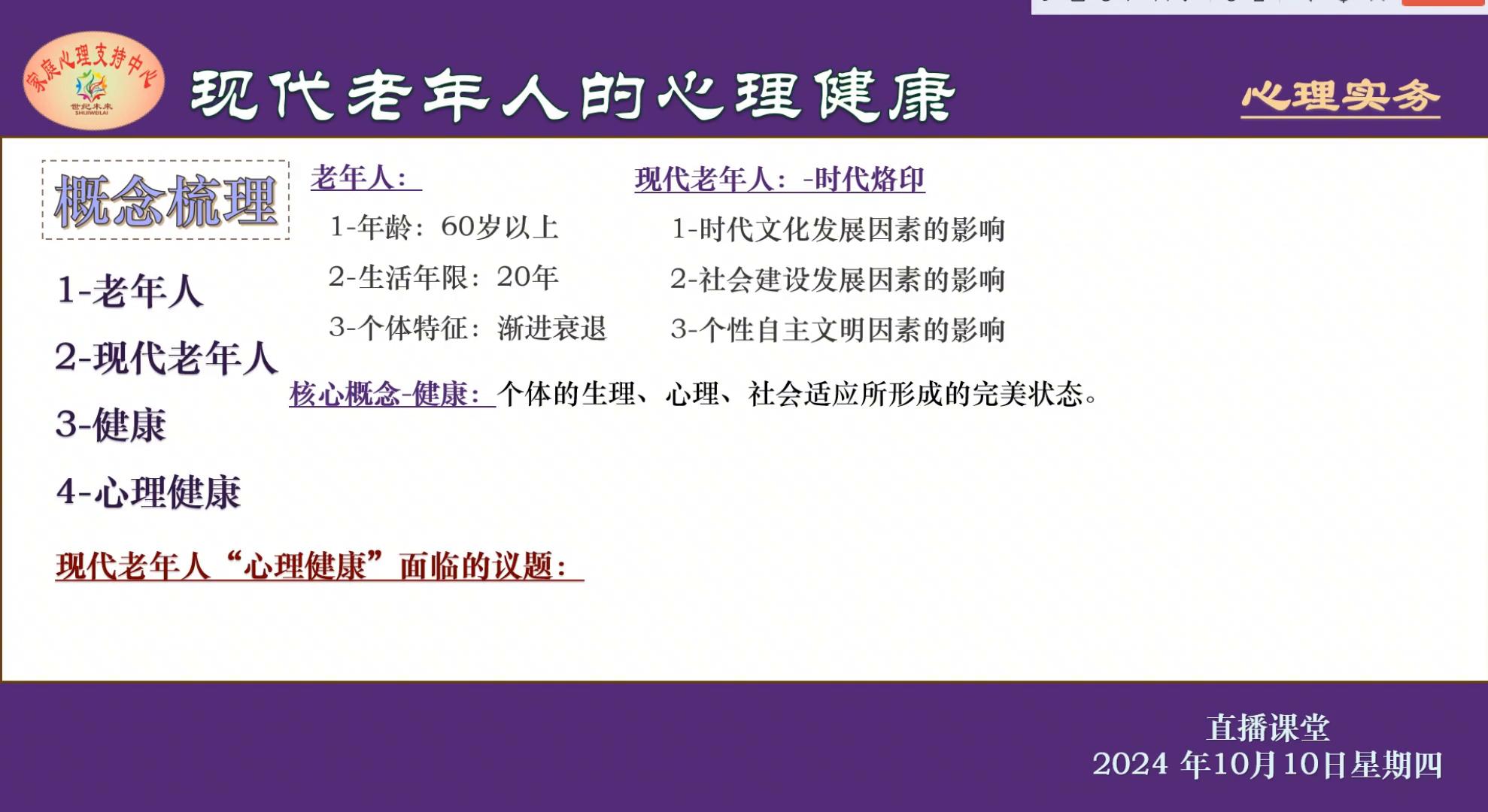 这里是星期四的直播课堂,今天的主题是现代老年人的心理健康。今天重点的是给大家做一个概念的梳理。