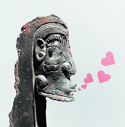 以人头形銎青铜戟为原型制作的送爱心表情包