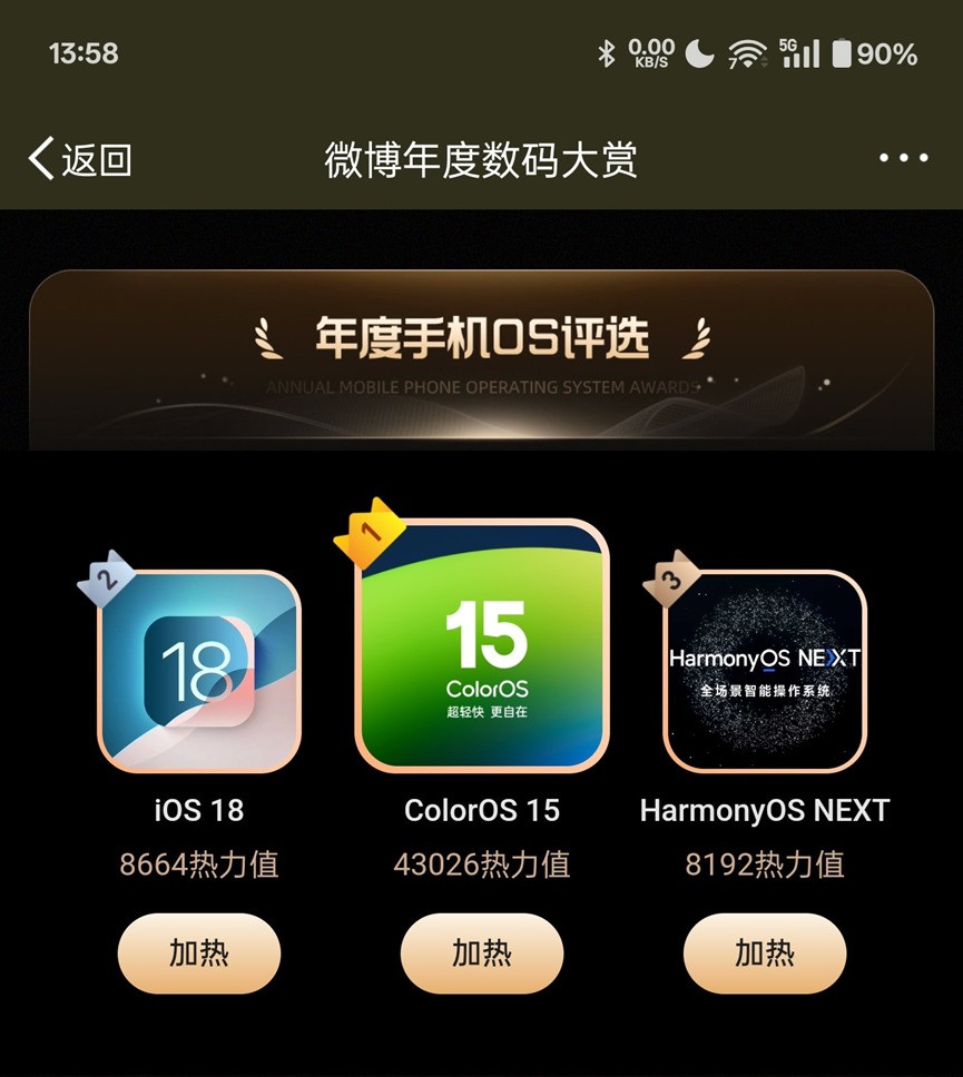 在年末的“微博年度数码大赏”的手机OS分类评选中,ColorOS 15力压iOS18成功登顶。