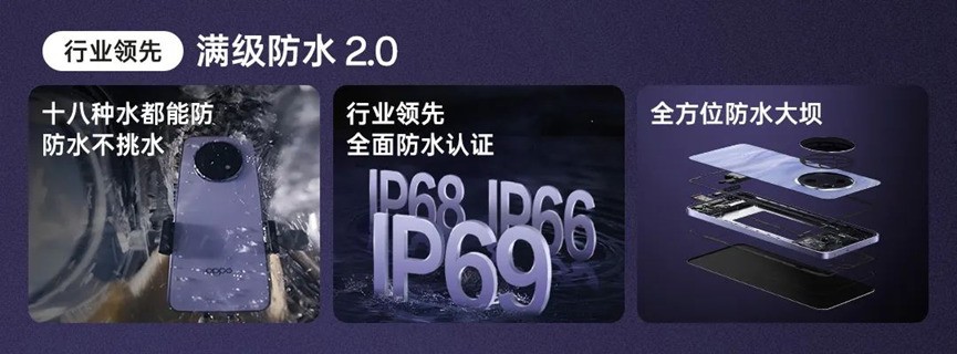 先看防水性能,近期发布的OPPO A5 Pro首发了OPPO的“耐用科技3.0”,不仅具备IP69 、P68、 IP66的满级防水规格,更是带来号称行业唯一的满级防水2.0,十八种水都能防。首销期间赠送的进水保修服务更是体现了OPPO对其防水性能的十足信心。