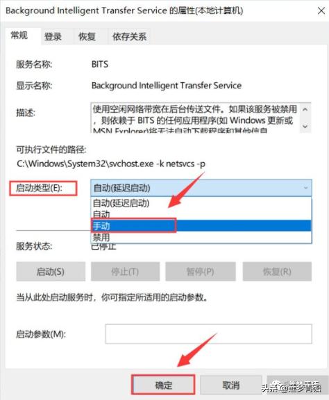 5.启动类型选择【手动】,然后点击【应用】并【确定】。